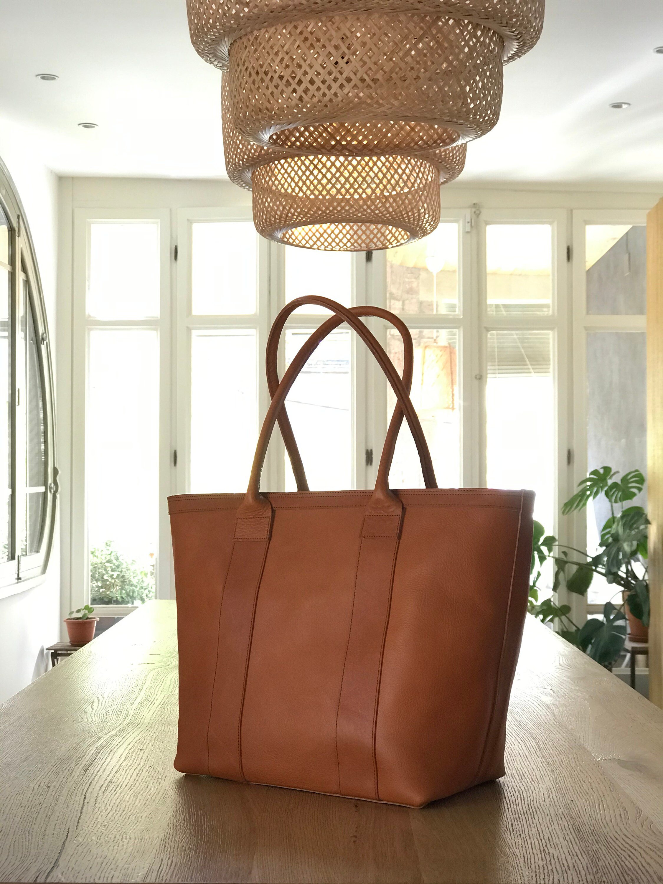 Oversized leather bag, with a subtle design, that comes with zipper and inside lining, 1 zippered pocket and 3 open pockets, to keep smaller items separated from the large compartment. If you need a different combination of inside pockets we can also make it.
